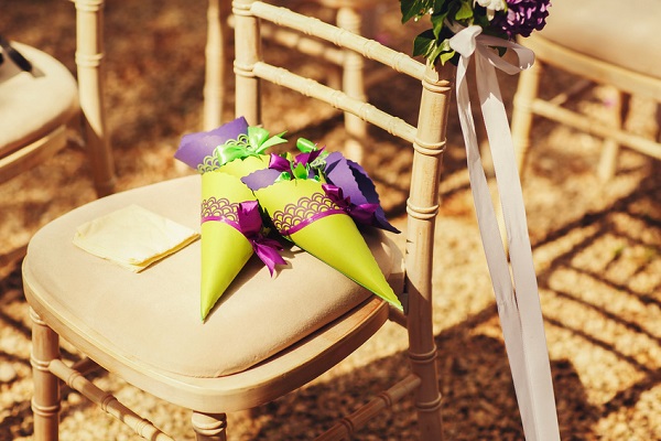 - hang ze aan de ceremoniestoelen met een speld of lint dat in een inkeping is geschoven